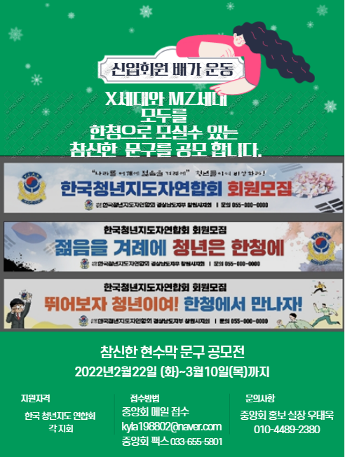 본 회의 홍보 및 신입회원을 확충하고자 '한청 신입회원 배가 운동’을 위해 각 지회에 게첨할 현수막 시안 문구 공모를 합니다. 자세한 내용은 첨부된 포스터를 참조하시기 바랍니다.